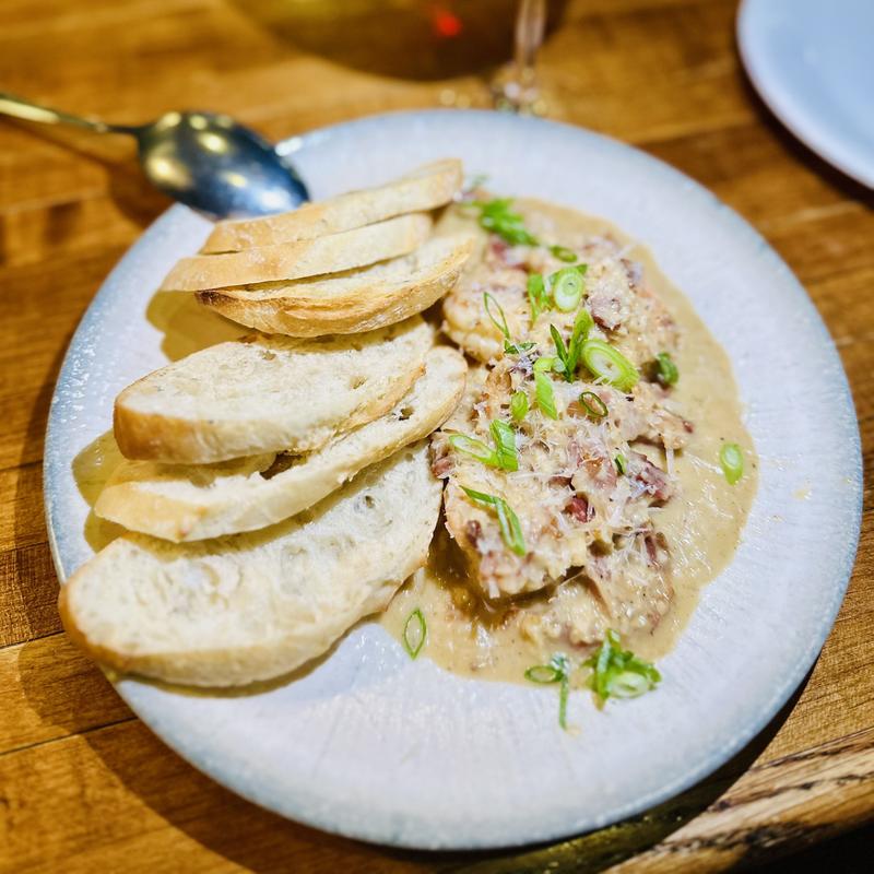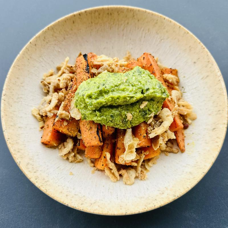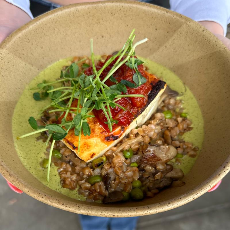 Farro, English peas, oyster mushrooms, green goddess, smoked tomato jam.