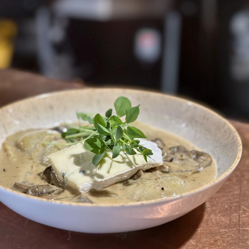 Shallot, garlic, wild mushroom, cambozola cream, truffle oil.