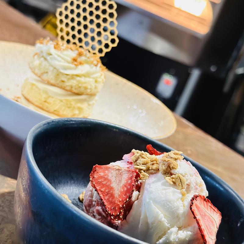 Cheesecake ice cream, strawberry rhubarb jam swirls, lavender honey granola, dehydrated strawberries