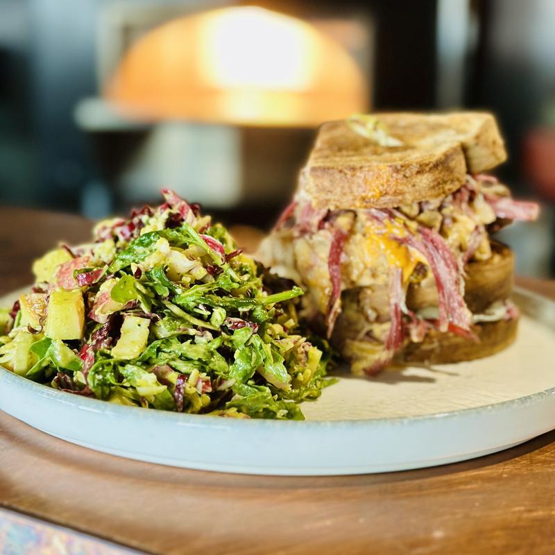 Corned beef, thousand island, sauerkraut, gruyere, marbled rye.