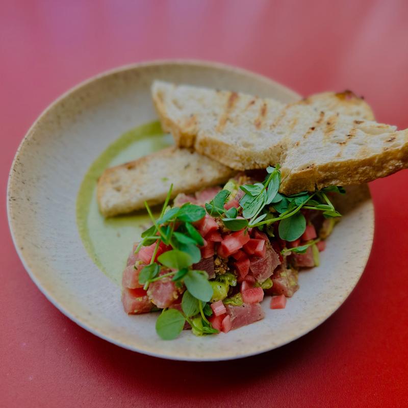 Spring herbs, avocado, mama lils, pickled rhubarb, pine nuts, sourdough.