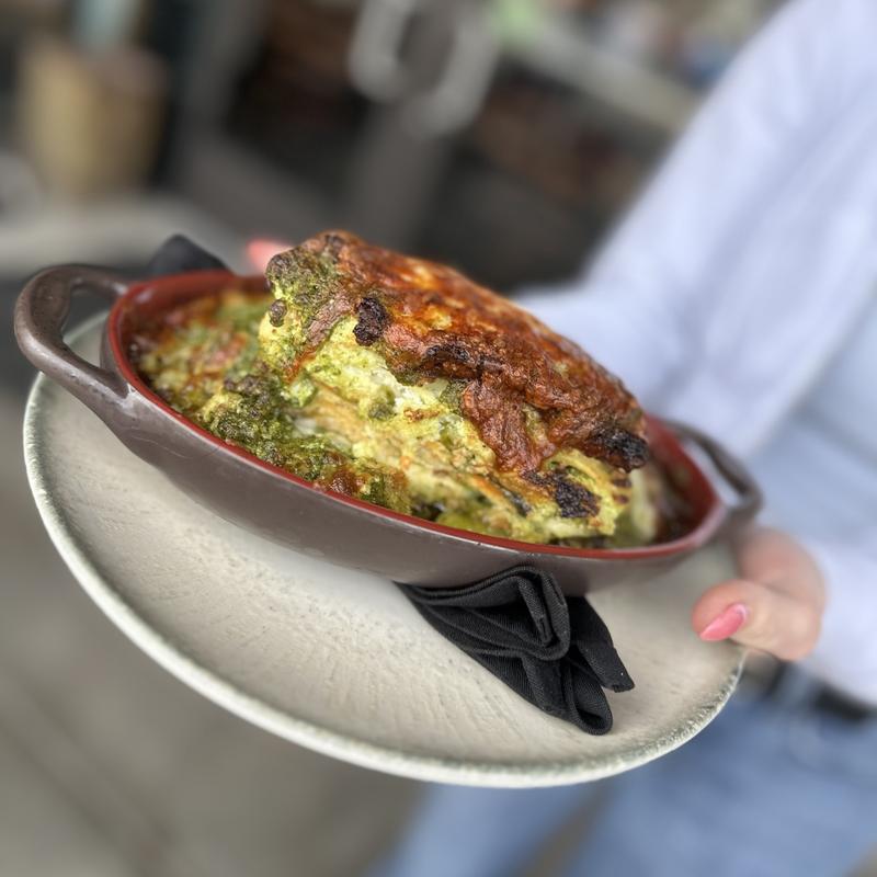Pancetta, spinach, English peas, asparagus, pesto, and all of the cheese.