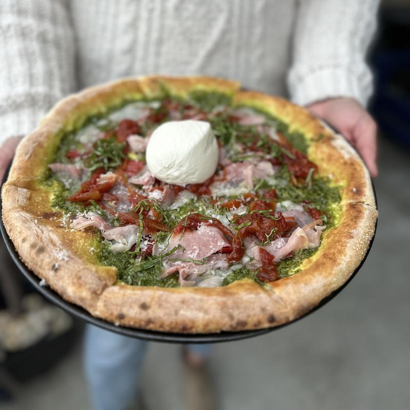 Pesto, prosciutto, mama lils, smoked tomato jam, parmesan reggiano, basil.