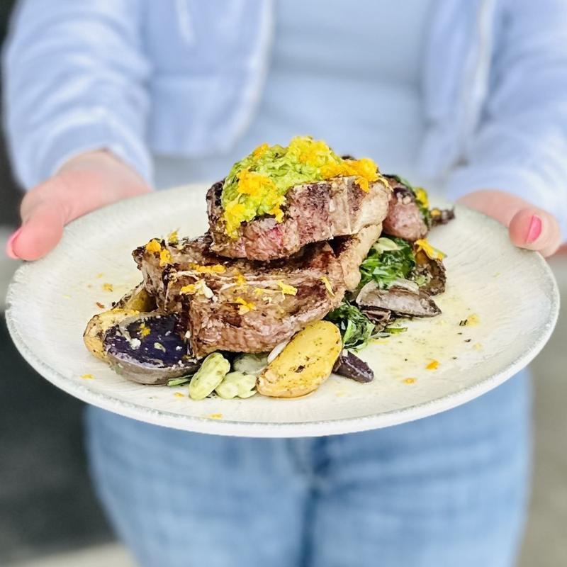 Tri Tip, Shaved Winter Vegetables, Chili Crunch, Scallion