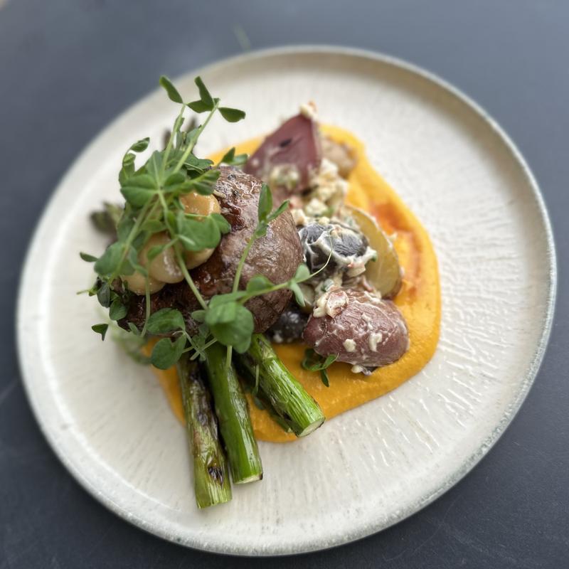 Warm potato salad, asparagus, carrot reduction, and candied garlic.