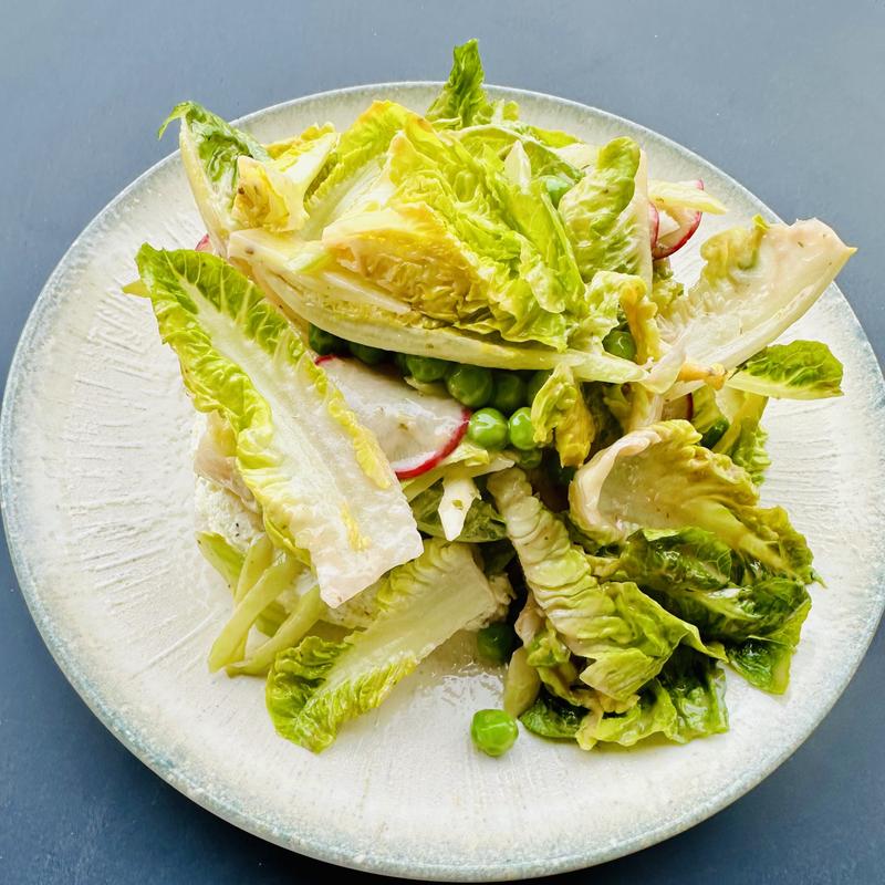 Small $10.00 | Large $18.00 • Gem lettuce, English peas, radish, celery, chevre, rhubarb vinaigrette.