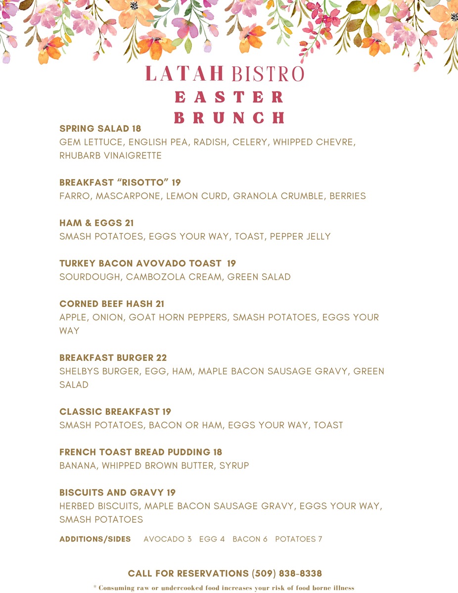 Every time I either dine in or get takeout at Latah Bistro, I am so impressed with the food. It is so good; and the service is great. It is a special place to dine with friends or family. I will continue to take and meet friends there. The food is heavenly. Parking: Parking is extremely convenient, accessible and free.
