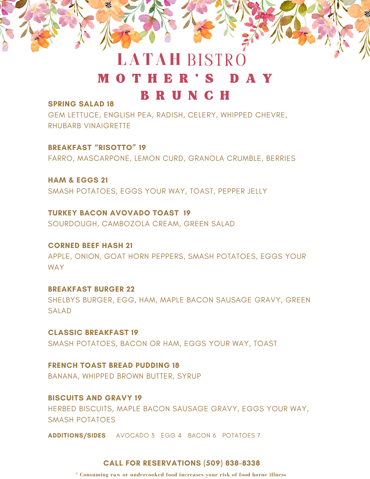 We’re opening our doors for a special Easter Sunday brunch from 9:00 AM to 2:00 PM. Call 509-838-8338 to make your reservation